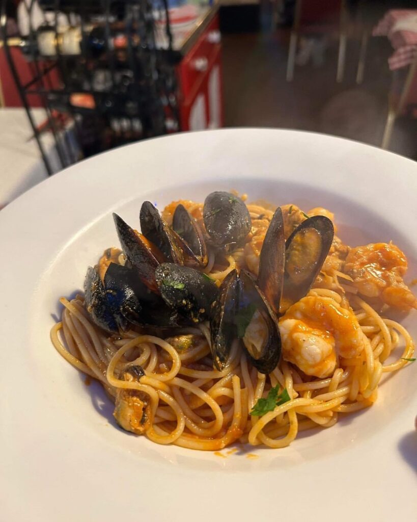 Pasta with mixed seafood served in a white wine, garlic, chilli and tomato sauce